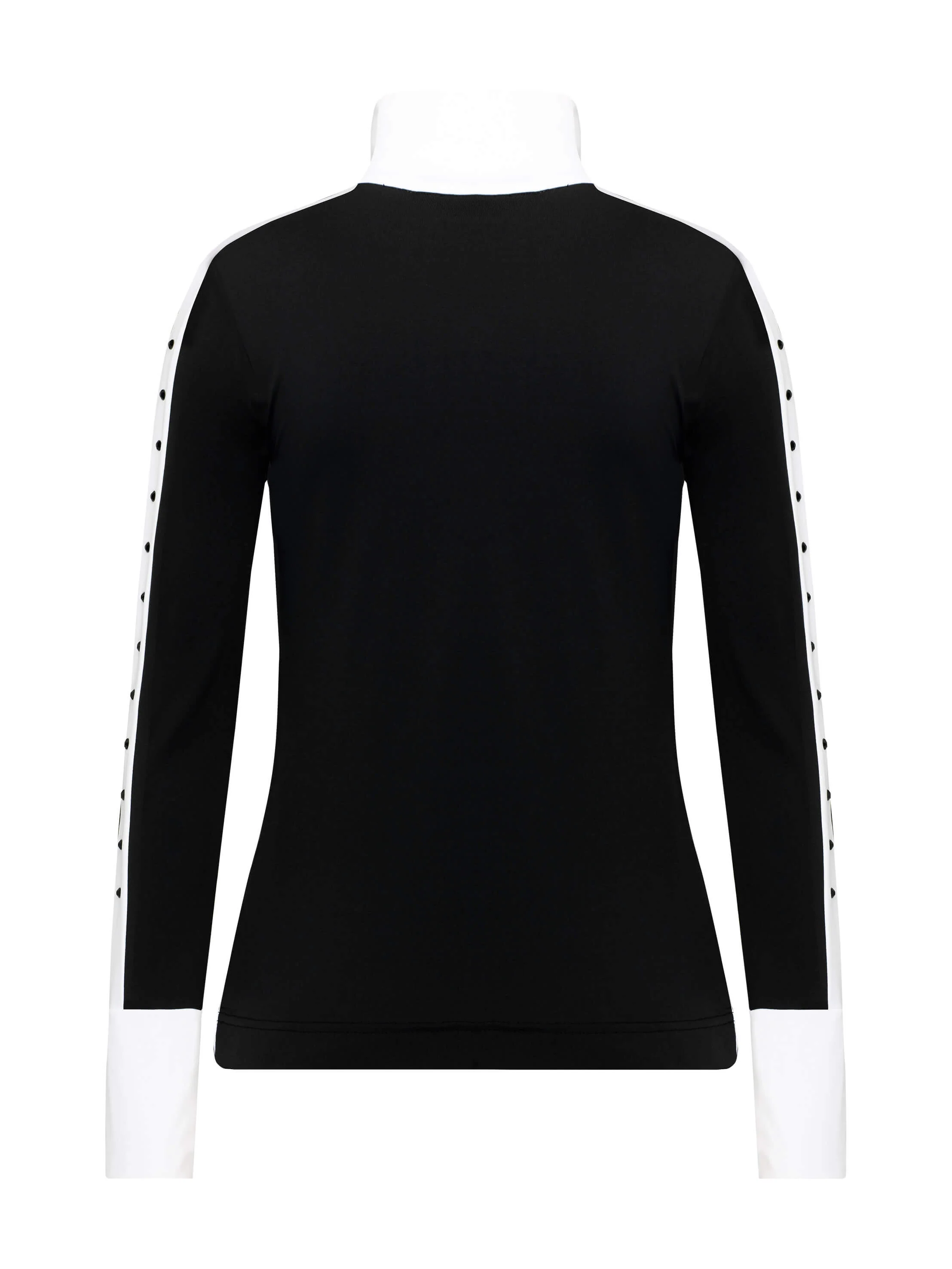 Combining sporty design with high-fashion details, the ELEONORE SPECIAL women’s first layer is embellished with Swarovski® crystals along the sleeves and features a YKK VISLON® Delta Shaped Elements zipper in metallic look. The smooth-operating zipper ensures easy on and off. The Toni Sailer 3D logo perfectly matches the stylish design. Made from a French functional jersey, this baselayer offers lightweight, breathable, and quick-drying properties for skiing.